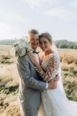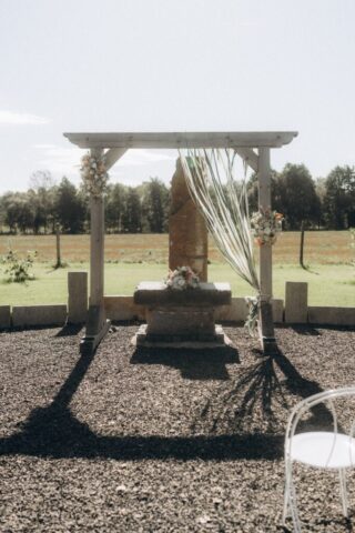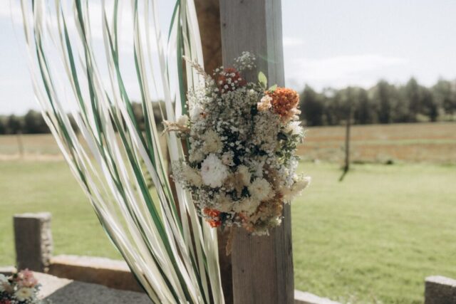 Týnka si přála jemnou kombinaci bílých a přírodních tónů, které dokonale ladily s krajinou i jejím něžným stylem. Květiny byly lehoučké, vzdušné – jako by je právě pohladil vítr. Každý detail měl své místo – slavobrána, svatební stůl i drobné dekorace vyprávěly jejich příběh o lásce, pohodě a radosti. 💐✨